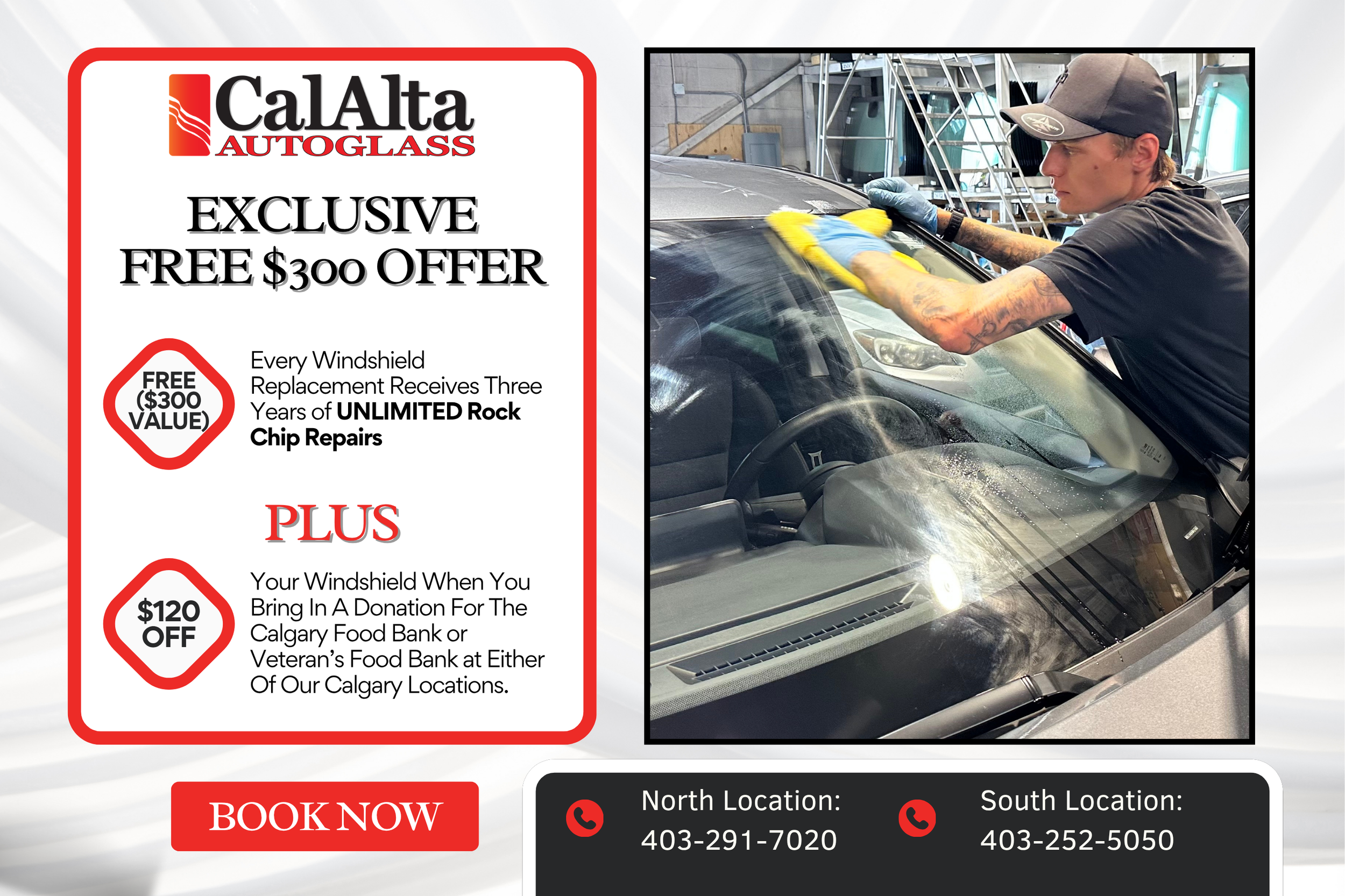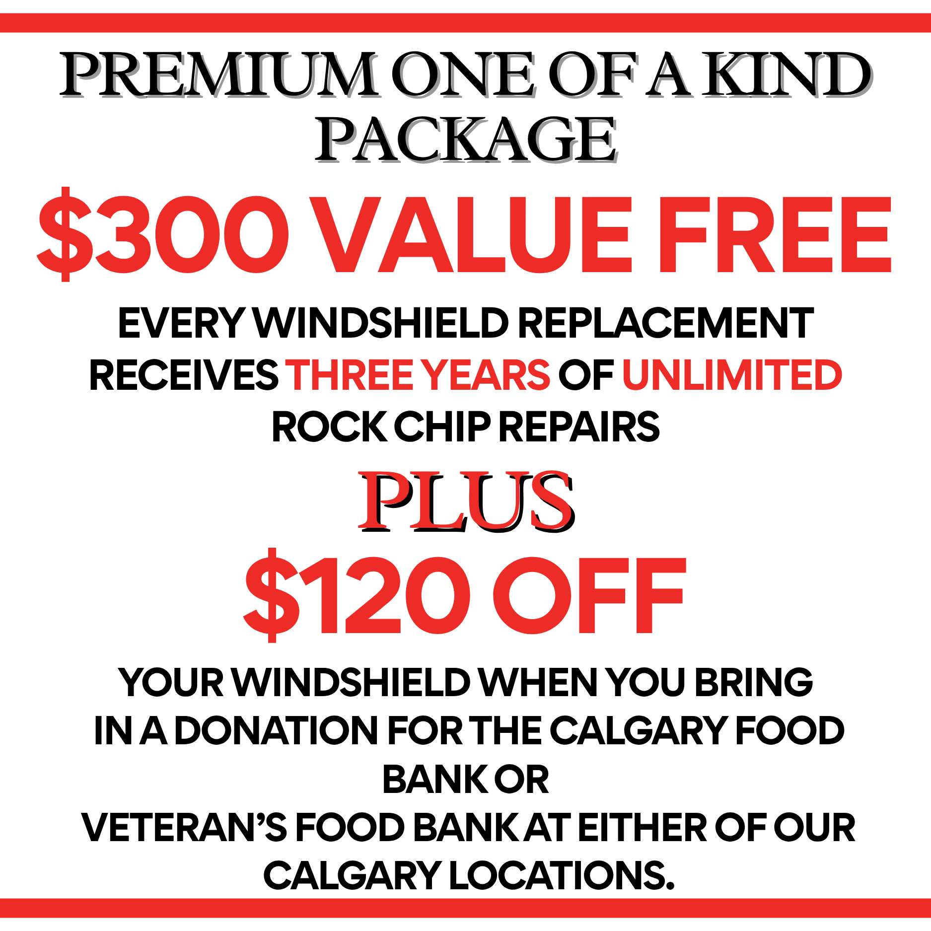 $120 Off Your Windshield Replacement When You Bring In a Donation for the Calgary Food Bank or Veteran’s Food Bank at Either of Our Calgary Locations.